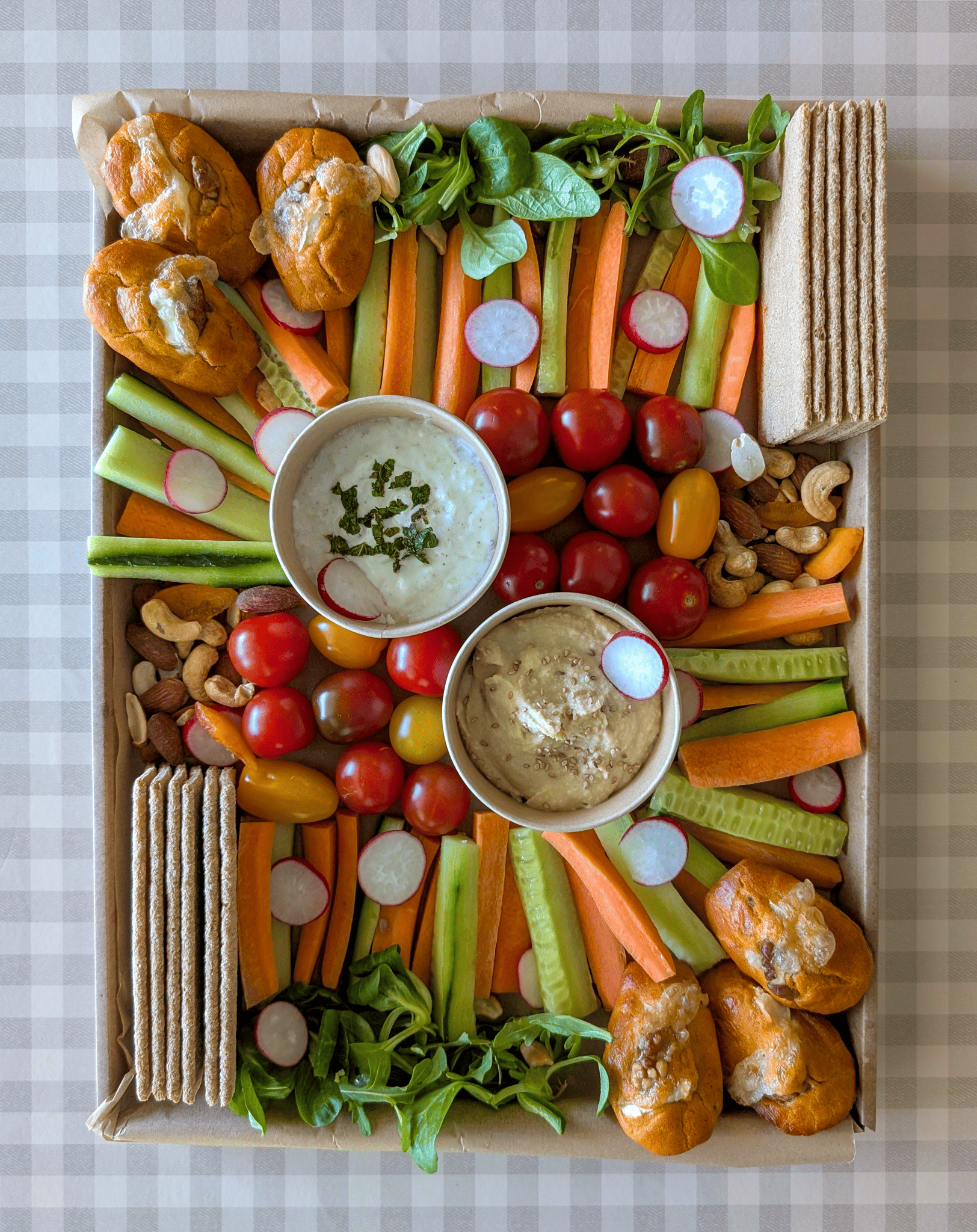 • Légumes à croquer : batonnets de carottes et concombres, lamelles de radis, tomates cerises.