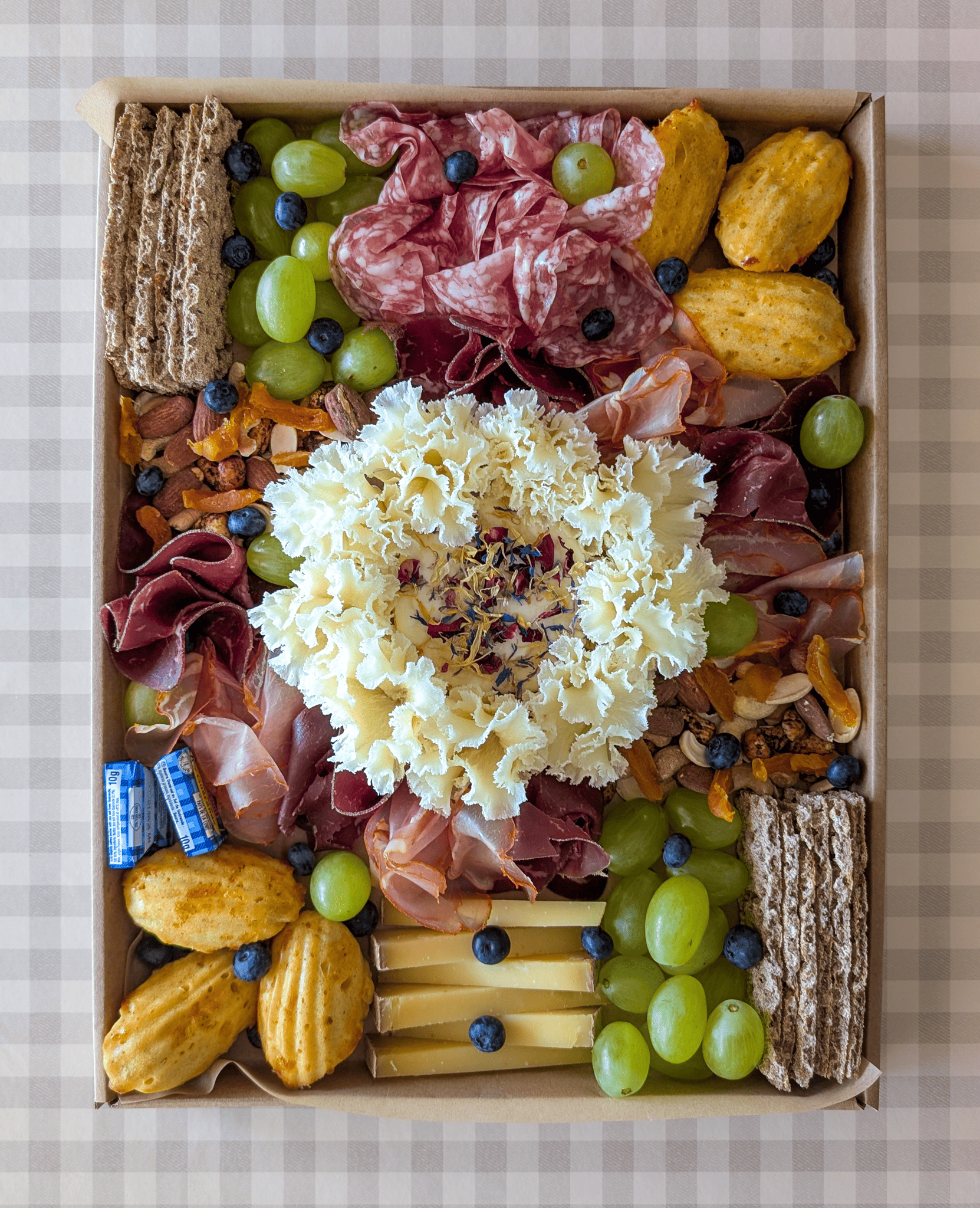 - Fromages sélectionnés : tête de Moine (Suisse), comté (France) et chèvre frais (France) enrobé de miel et fleurs comestibles.