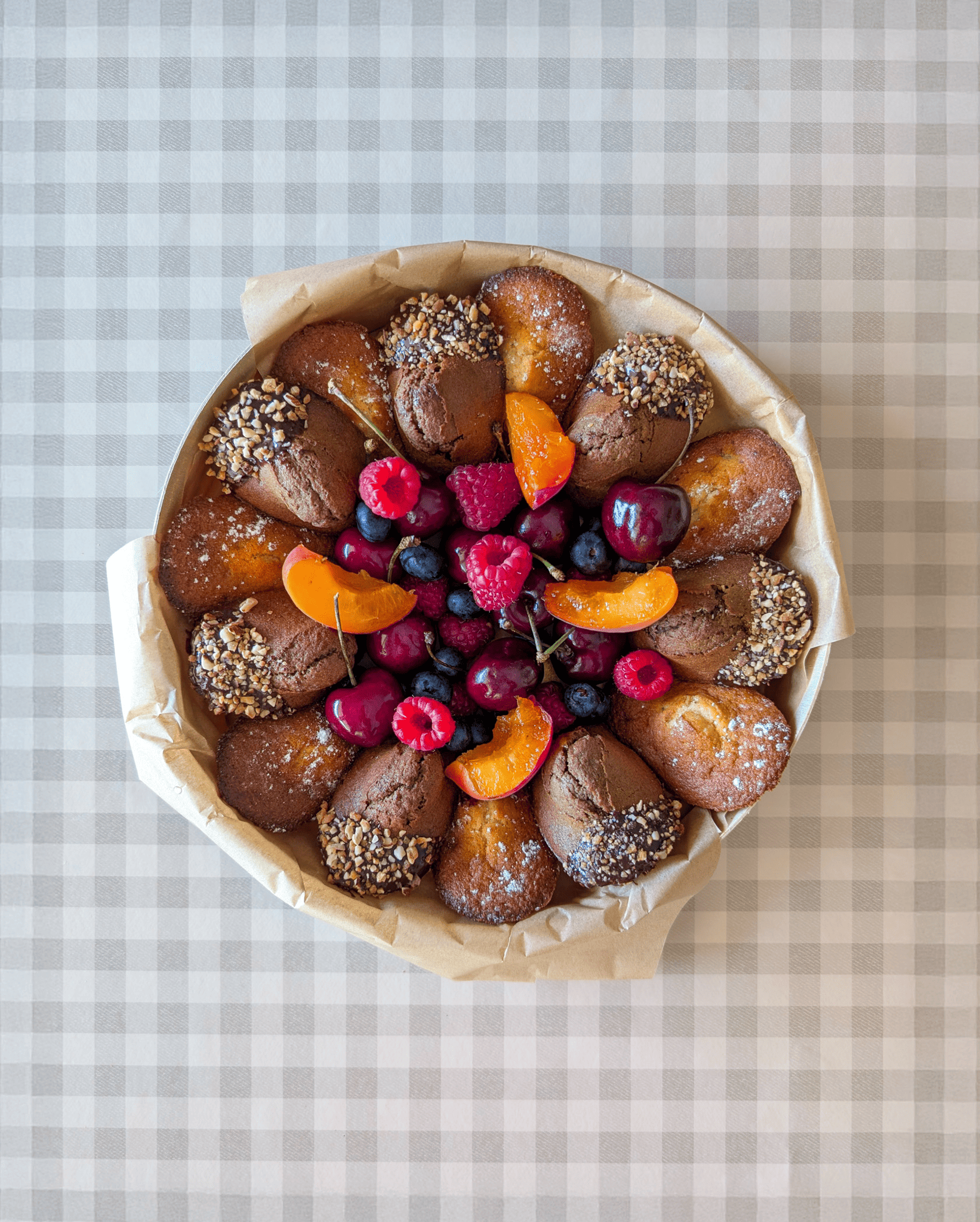 Pour varier les madeleines, choisir deux goûts différents dans les options, sinon, choisir le même. Les madeleines avec coque chocolat ajoutent un supplément d’1€/pièce.